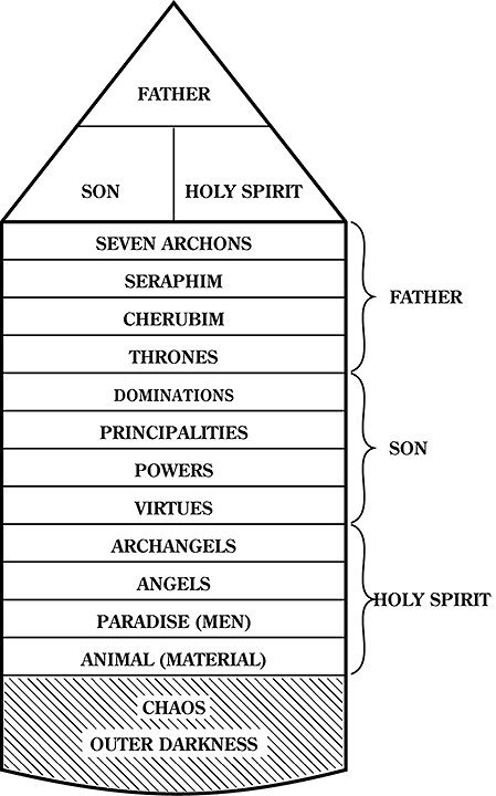 And so the plan was this: Adam and Eve would have to struggle upward, slowly, painfully, through countless lives, experiencing the bitterness of constant birth and death. At long, long last they would regain Paradise, take up once more the bodies (“garments”) of light they had there discarded, and from there on evolve upward through all the realms of subtle creation, until at last, the final barrier broken, they were to merge with God: Adam with the Son-Father and Eve with the Holy Spirit-Mother. (This is because, as we have already said, each spirit as it is breathed forth from the transcendent Father is polarized to the divine archetypes of either the Son [Male] or the Holy Spirit [Female], and spends the majority of its evolution in bodies of corresponding polarities.)